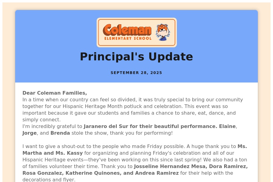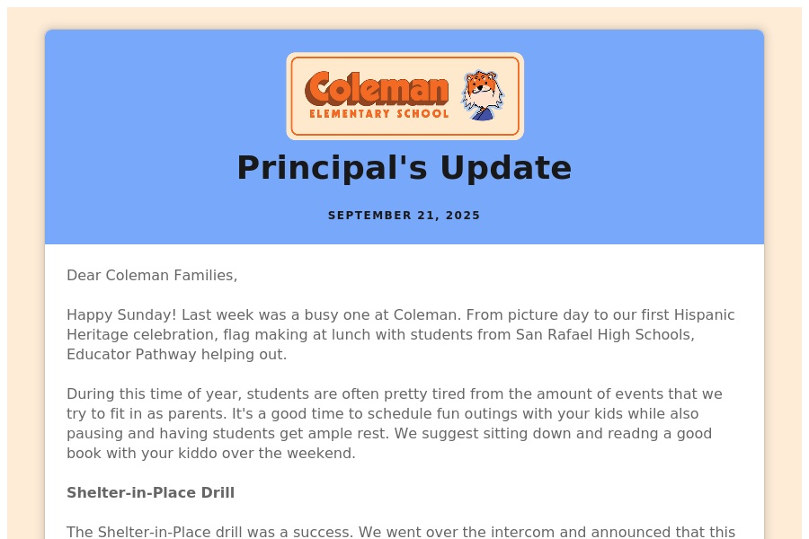 Principal's Update and Coleman Connect: Sunday, September 21, 2025