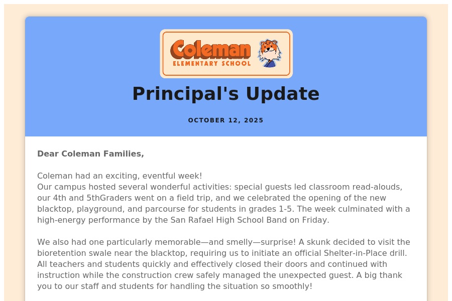 Principal's Update and Coleman Connect: Sunday, October 5, 2025
